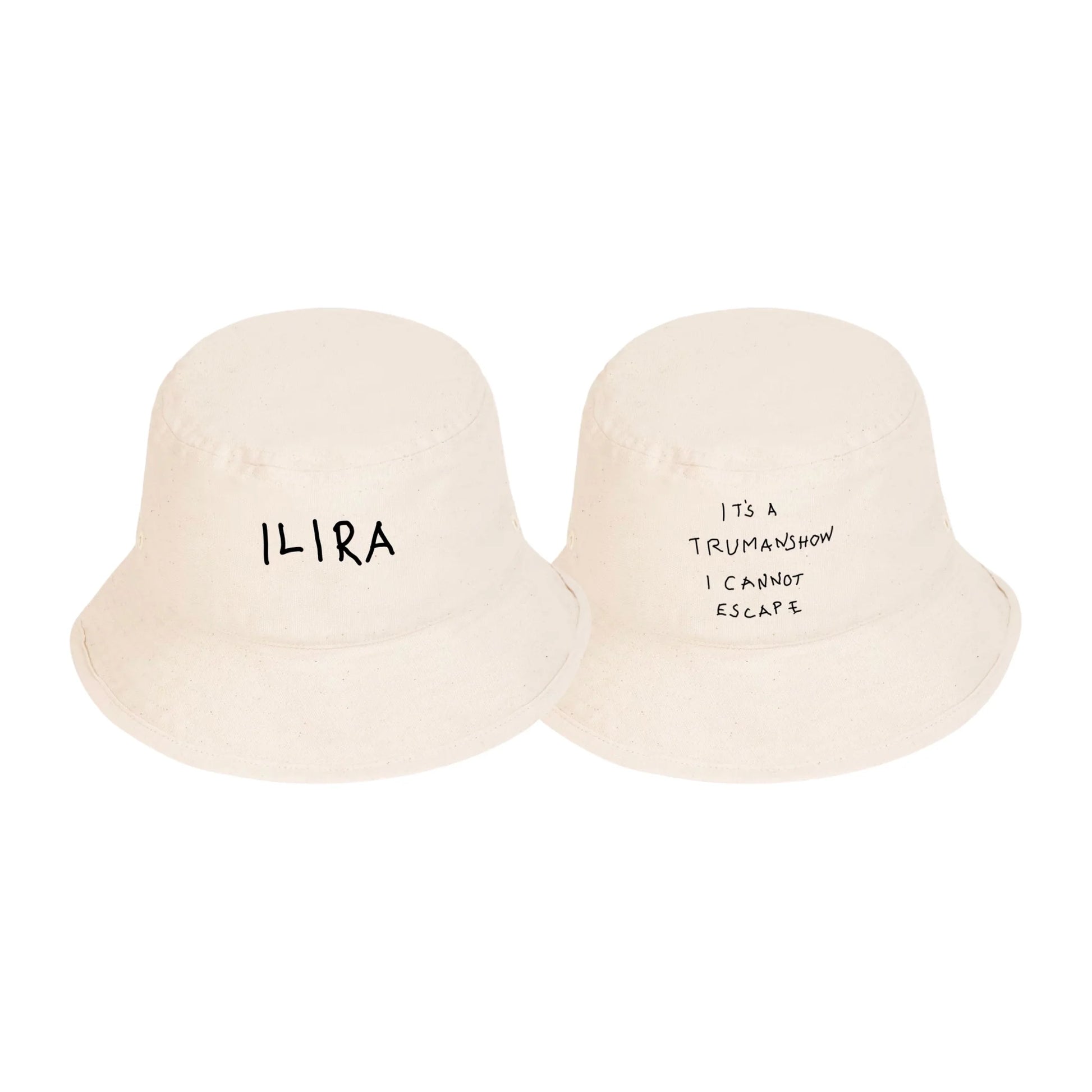 This Trumanshow Bucket Hat is embroidered with ILIRA’s original handwritten lyric, stitched onto sustainable canvas for the ones who see too much and shade themselves in style.